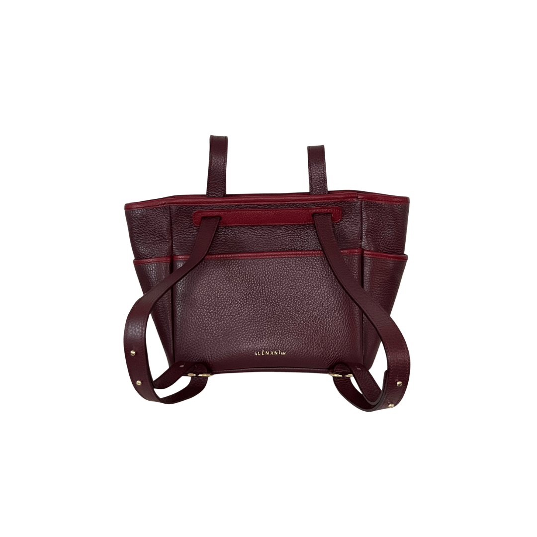 Borsa in pregiata pelle di vitello martellata con tasche esterne, tracolla fissa scorrevole e rifiniture in pelle a contrasto. La borsa presenta un’unica tracolla aggiustabile in lunghezza che ne permette la portabilità in modi diversi: spalla, cross-body, a mano e a zaino.