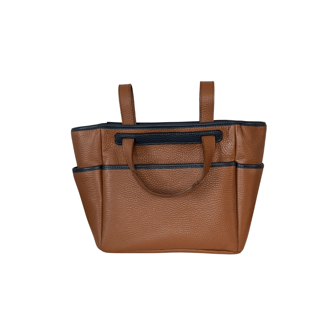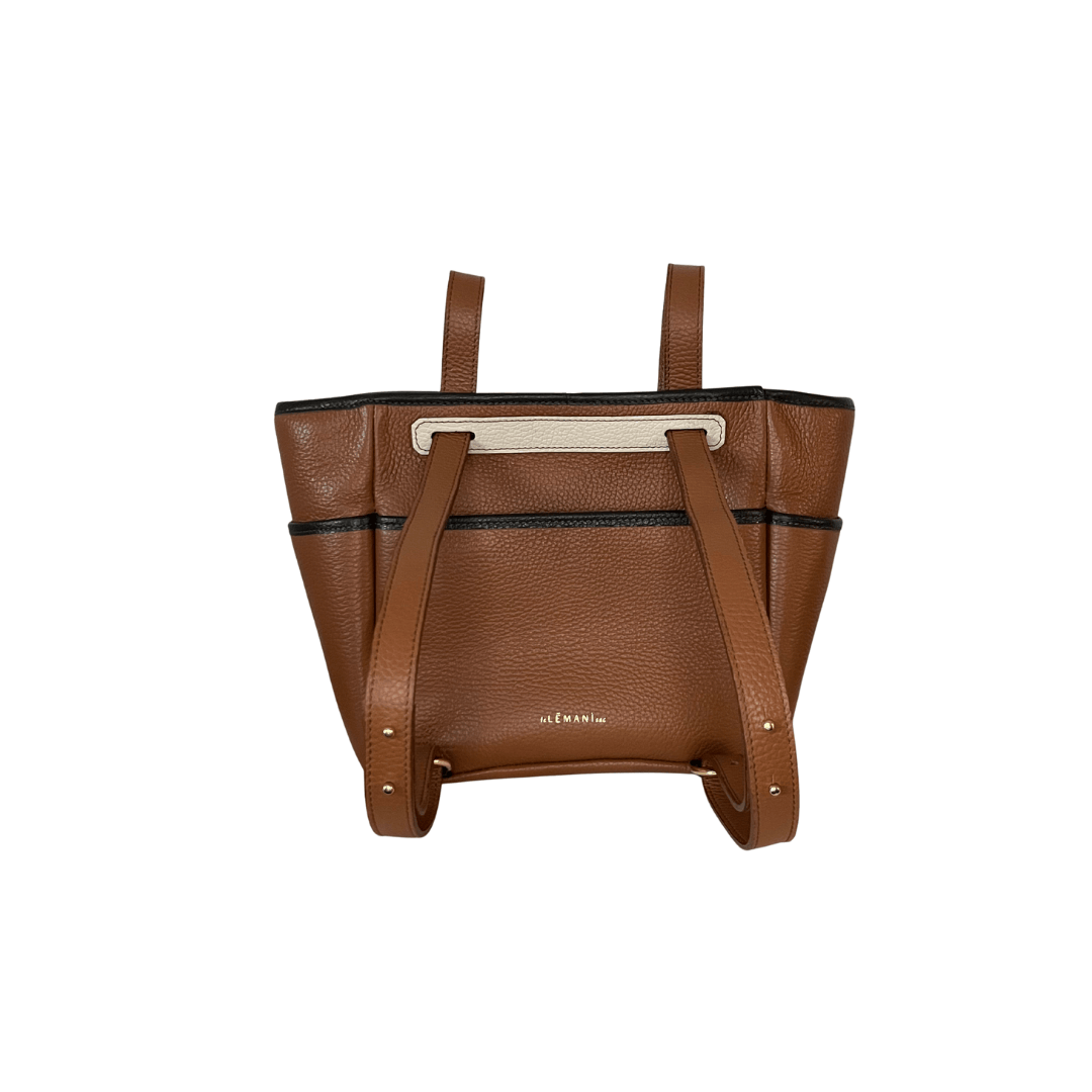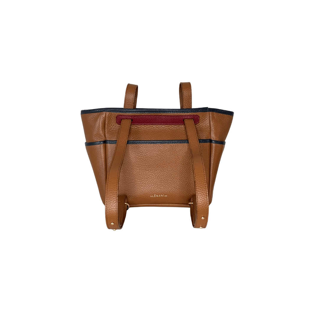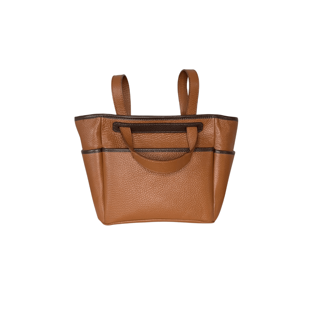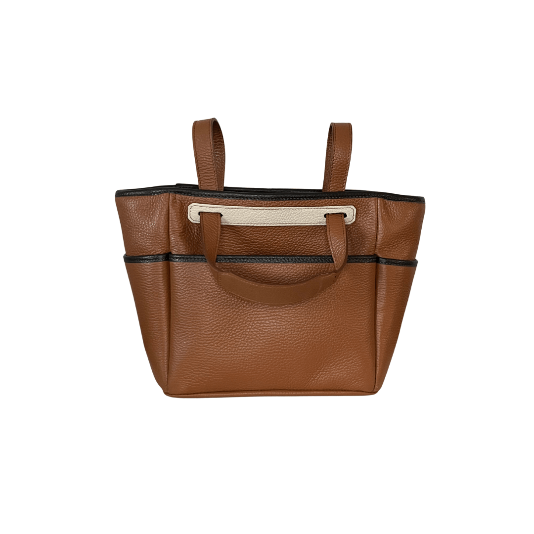Borsa in pregiata pelle di vitello martellata con tasche esterne, tracolla fissa scorrevole e rifiniture in pelle a contrasto. La borsa presenta un’unica tracolla aggiustabile in lunghezza che ne permette la portabilità in modi diversi: spalla, cross-body, a mano e a zaino.