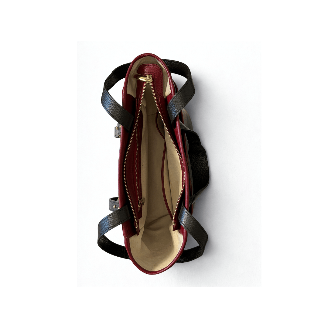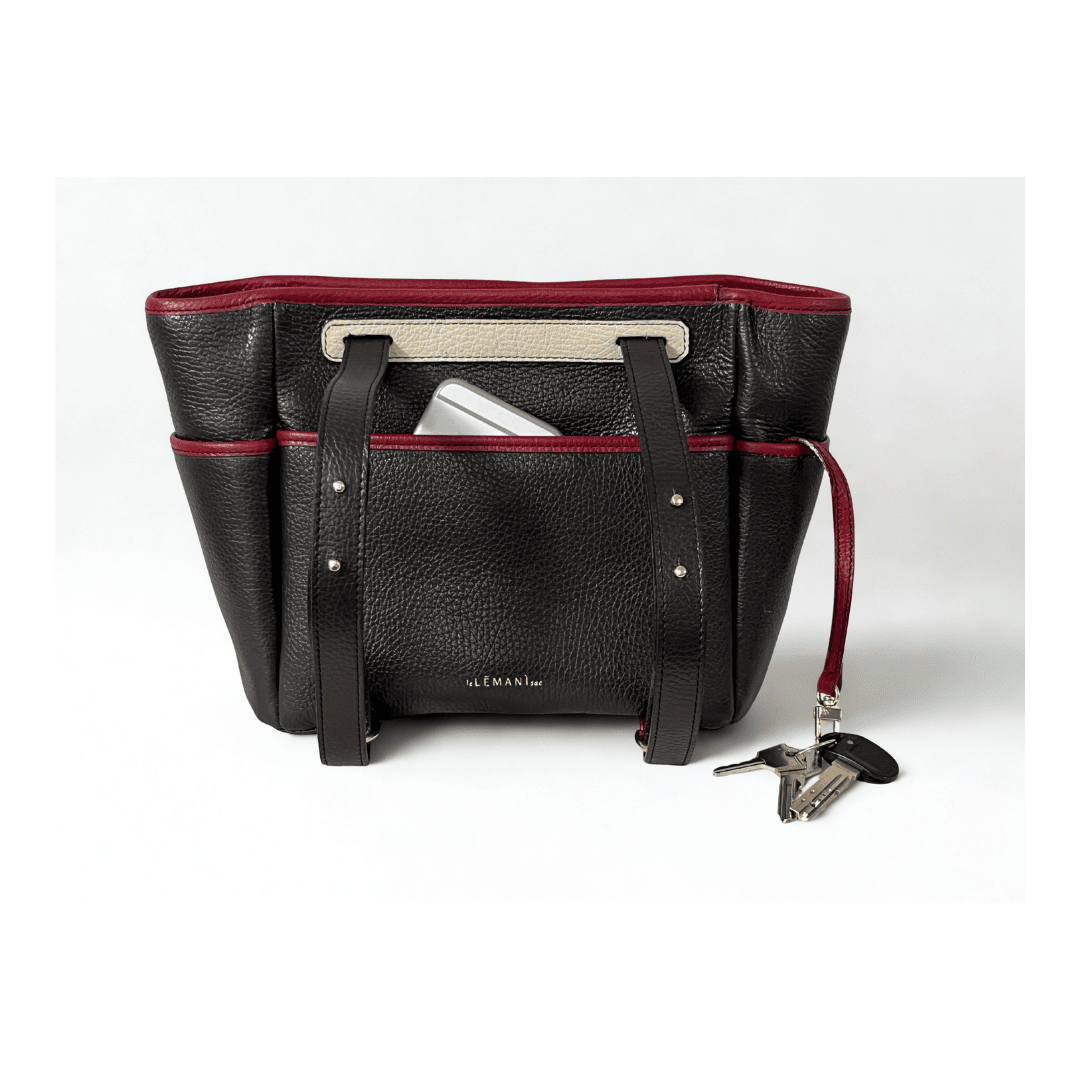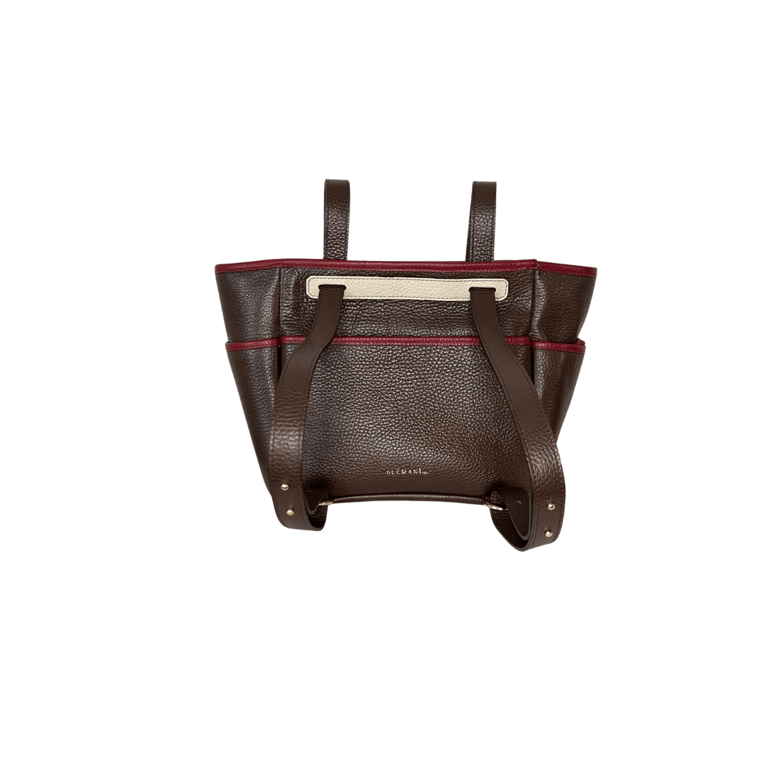 Borsa in pregiata pelle di vitello martellata con tasche esterne, tracolla fissa scorrevole e rifiniture in pelle a contrasto. La borsa presenta un’unica tracolla aggiustabile in lunghezza che ne permette la portabilità in modi diversi: spalla, cross-body, a mano e a zaino.