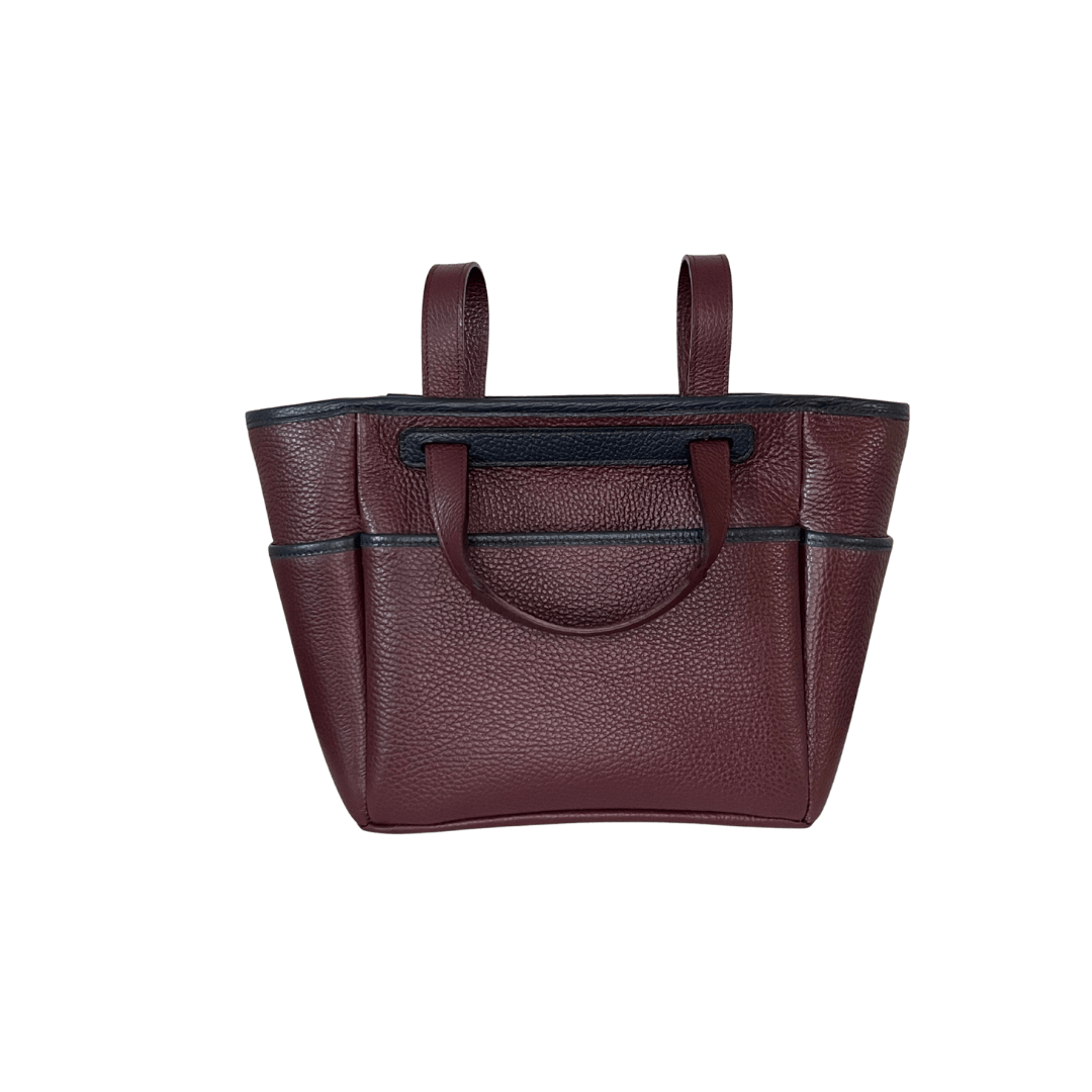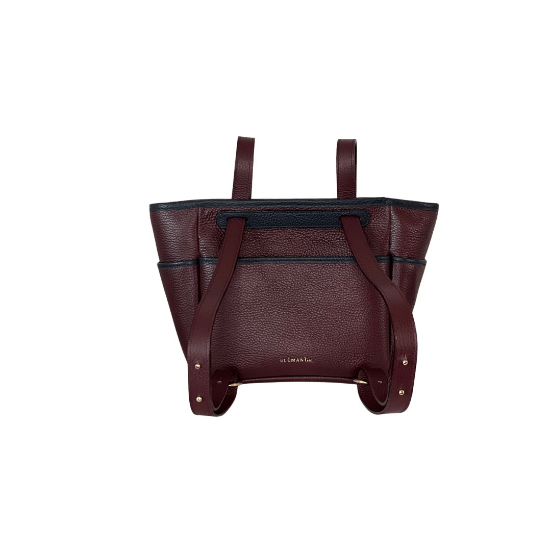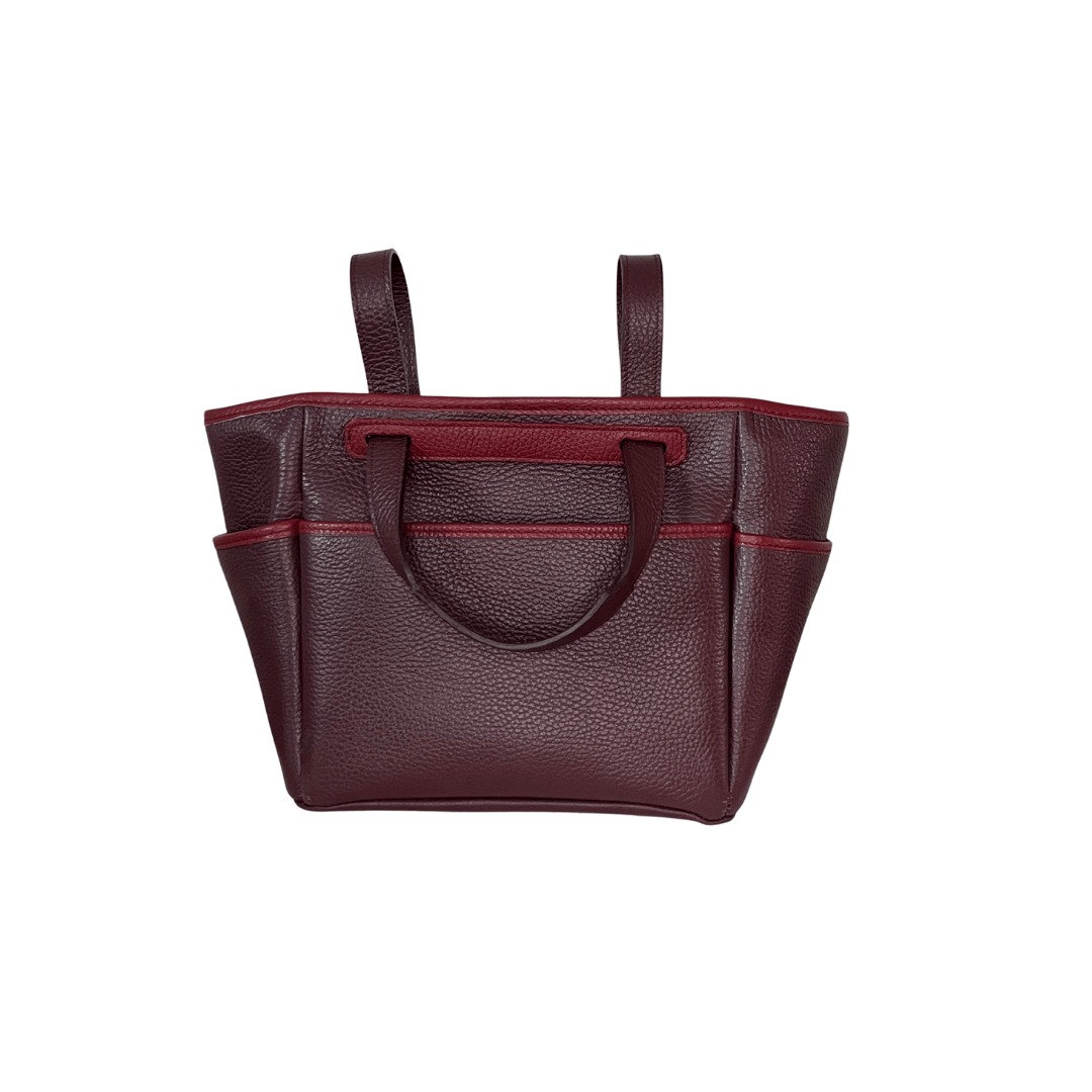 Borsa in pregiata pelle di vitello martellata con tasche esterne, tracolla fissa scorrevole e rifiniture in pelle a contrasto. La borsa presenta un’unica tracolla aggiustabile in lunghezza che ne permette la portabilità in modi diversi: spalla, cross-body, a mano e a zaino.