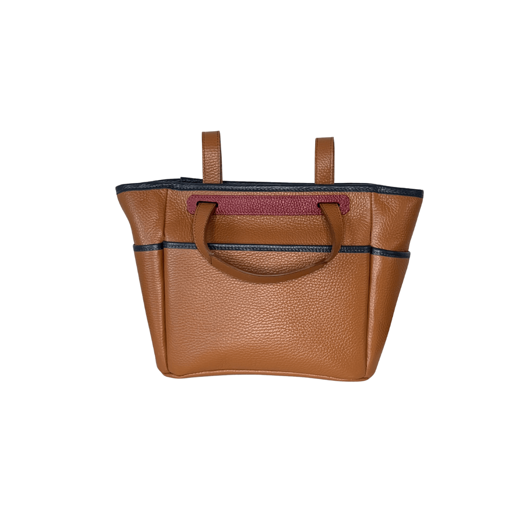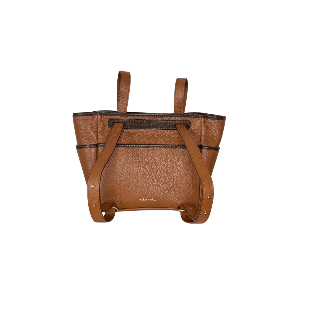 Borsa in pregiata pelle di vitello martellata con tasche esterne, tracolla fissa scorrevole e rifiniture in pelle a contrasto. La borsa presenta un’unica tracolla aggiustabile in lunghezza che ne permette la portabilità in modi diversi: spalla, cross-body, a mano e a zaino.