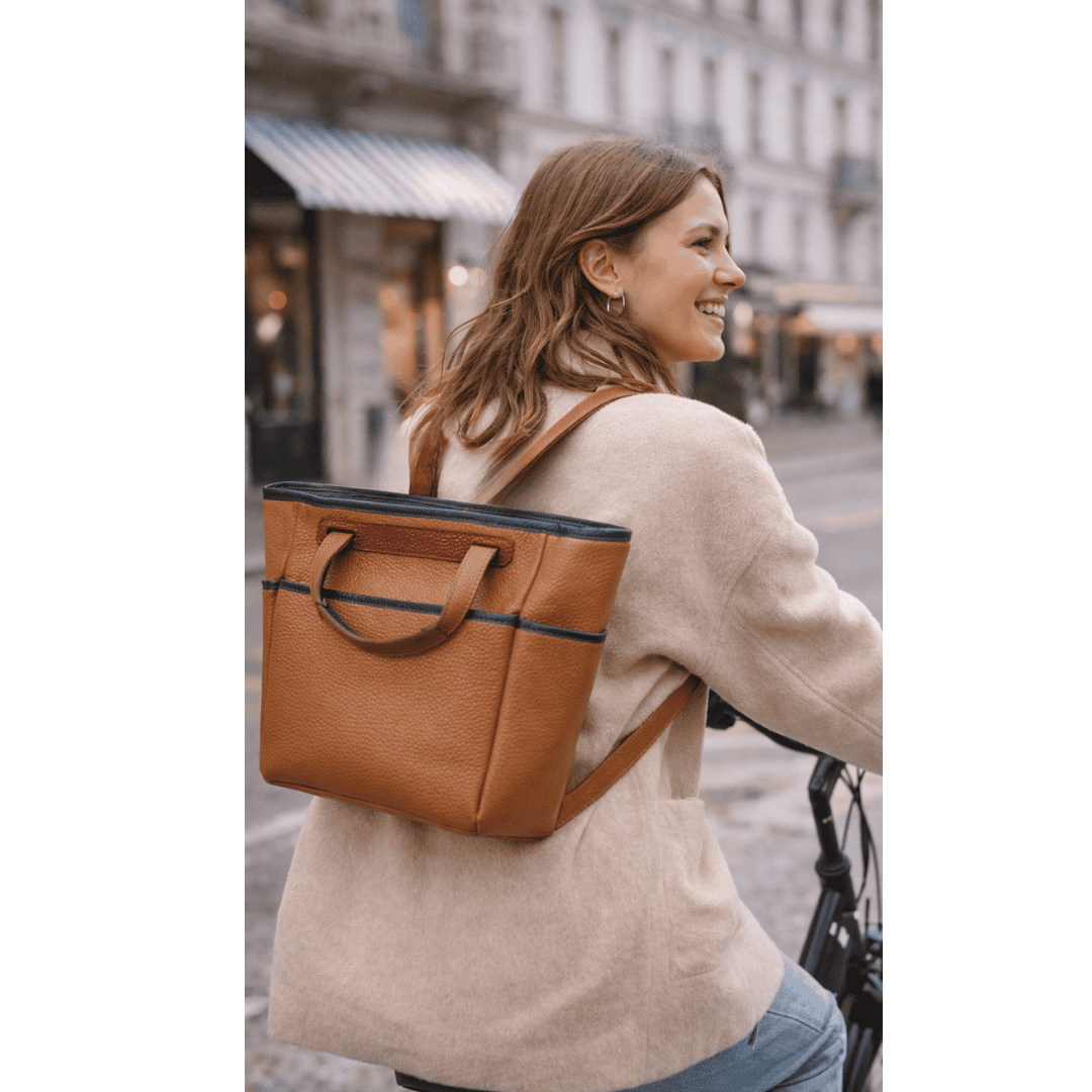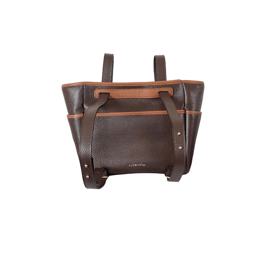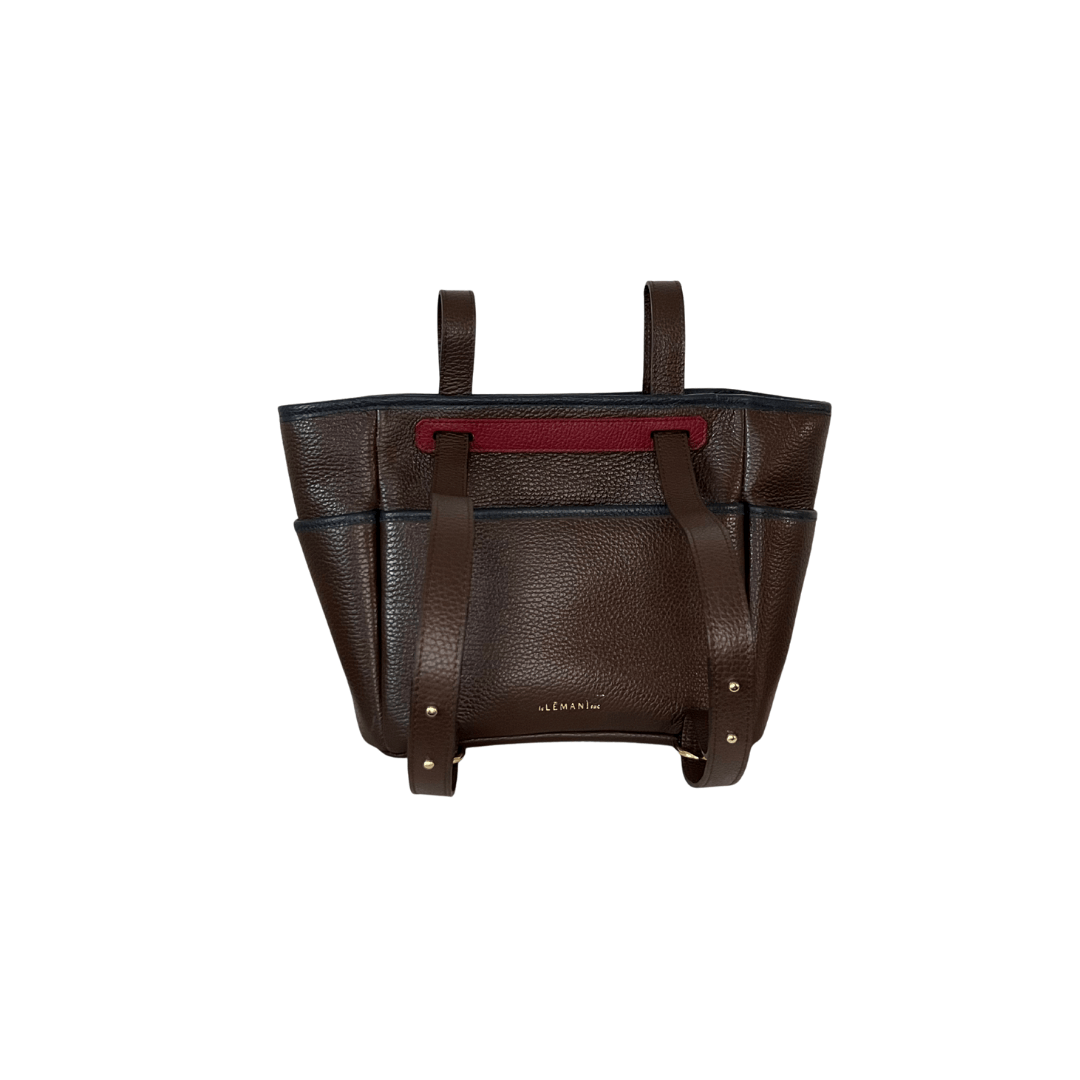 Borsa in pregiata pelle di vitello martellata con tasche esterne, tracolla fissa scorrevole e rifiniture in pelle a contrasto. La borsa presenta un’unica tracolla aggiustabile in lunghezza che ne permette la portabilità in modi diversi: spalla, cross-body, a mano e a zaino.